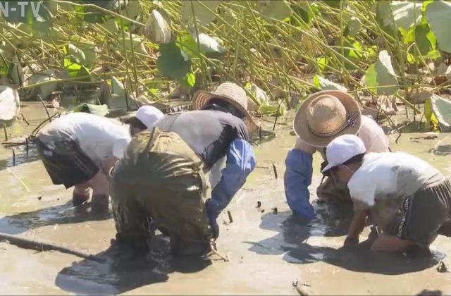 泥まみれになりながら挑戦 たつの市の小学生がレンコン掘り