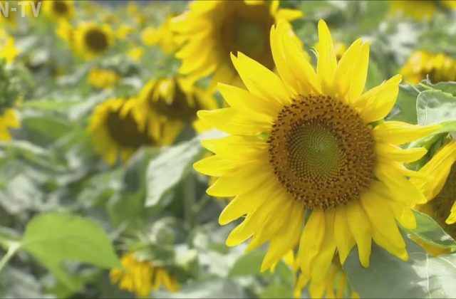 佐用町で家族連れが楽しむ 畑一面に咲き誇るヒマワリ