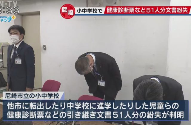 尼崎市立小中学校で引継ぎ文書51人分を紛失