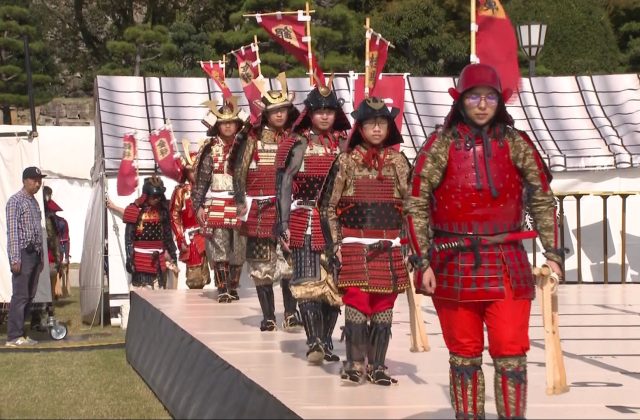 「人間将棋」姫路の陣 甲冑姿の人の駒が将棋盤を動く