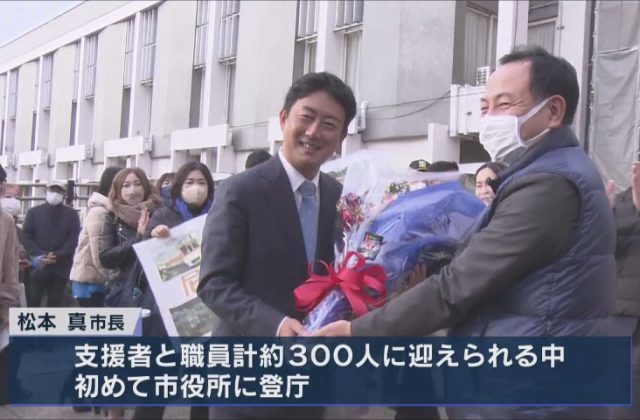 尼崎市の松本真新市長が初登庁 「市民の代表として向き合う」