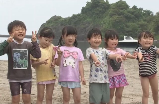 新温泉町の海水浴場で海開き 園児らが水遊び楽しむ
