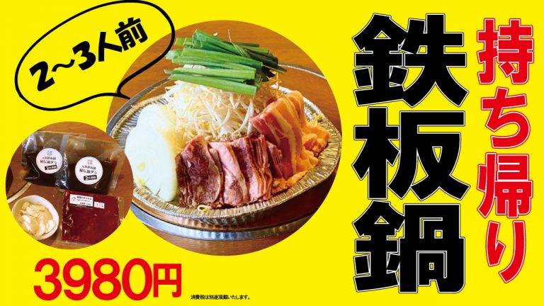 | 提供メニュー | 持ち帰り鉄板鍋 2~3人前 3980円 |